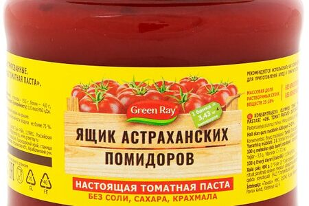 Паста томатная Green Ray Ящик Астраханских помидоров 490г – 100% натуральный и по-настоящему качественный продукт, изготовленный без добавления соли, сахара, крахмала и искусственных добавок. Отличается густой консистенцией, имеет ярко-красный цвет и насыщенный аромат. На приготовление 1 кг этой пасты уходит целых 7 кг спелых астраханских помидоров — единственных в России элитарных томатов, имеющих сертификат защиты места происхождения. В каждой столовой ложке пасты содержится суточная норма ликопина – мощнейшего из известных науке природных антиоксидантов. Продукт полностью готов к употреблению. Прекрасно подойдет для приготовления первых и вторых блюд, соусов, закусок. Без ГМО. Герметично закрытая стеклянная баночка надежно сохраняет свежесть в пределах всего срока годности.
