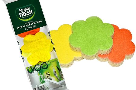 Губка для мытья посуды Master Fresh 3шт незаменимая помощница, благодаря которой ваша посуда засияет чистотой! Губки в форме цветка изготовлены из крупнопористого европейского поролона и абразивной фибры повышенной плотности. Они не деформируются и не крошатся при долгом взаимодействии с водой, легко промываются даже после длительной эксплуатации, прекрасно впитывают жидкость, обеспечивают сильное и устойчивое пенообразование. Благодаря ярким расцветкам и оригинальной форме гармонично вписываются в любой кухонный интерьер и поднимают настроение. В упаковке 3 штуки. Миссия производителя продукции торговой марки Master Fresh : изготовление и продвижение качественных и доступных товаров повседневного спроса, делающих жизнь потребителей проще и легче.
