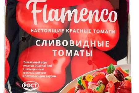 Помидоры Фламенко сливовидные 450г упаковка – томаты уникального сорта Internal Red, обладающие сбалансированным кисло-сладким вкусом и богатым ароматом. Насыщенно-красные внутри и снаружи, они содержат на 60% больше ликопина – мощного природного антиоксиданта, который снижает риски сердечно-сосудистых заболеваний, замедляет процессы старения, помогает сохранить здоровье глаз и молодость кожи. Кроме того, в их состав входят витамины А и С, калий и натуральная клетчатка. Фламенко – это отборные томаты премиум-класса. Мякоть у них сочная, плотная и мясистая, а кожица – глянцевая и тонкая. Сливовидные плоды отлично подойдут как для употребления в свежем виде, так и для приготовления различных закусок и горячих блюд.