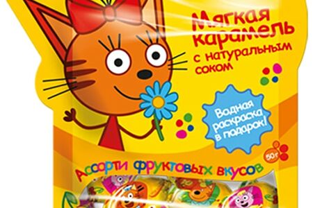 Карамель Три кота мягкая с натуральным соком Ассорти фруктовых вкусов + водная раскраска 50г доставка