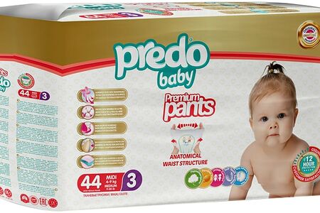 Подгузники-трусики Predo Baby №3 4-9кг 44шт производятся из натуральных гипоаллергенных материалов, которые позволят вашему ребёнку чувствовать себя комфортно. Они тонкие, что удобно при движении ребёнка. Воздухопроницаемые материалы позволяют коже малыша дышать. Внутренний слой с повышенной концентрацией SAP лучше поглощает и удерживает влагу. Кремовая пропитка защищает кожу малыша от опрелостей и снижает вероятность появление сыпи. Защитный барьер от протеканий. Внешняя поверхность боковых резиночек loop-hoop сделана из текстиля, они расстёгиваются в три этапа, что очень удобно. Полоска-индикатор наполняемости подгузника. Клапан для утилизации подгузника.