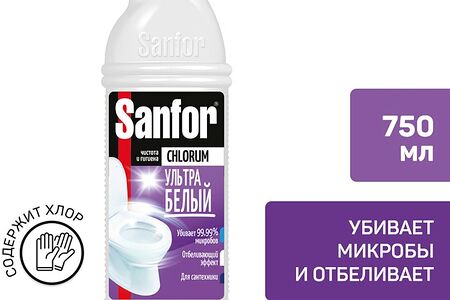 Средство чистящее Sanfor Ультра белый для раковин унитазов и уборки дома с хлором 750г – санитарно-гигиеническое средство, предназначенное для очищения и дезинфекции сантехники, канализационных стоков, напольных покрытий. Его эффективная формула с хлором всего за 2 минуты удаляет плесень, жир, мыльные подтеки, серый налет и прочие загрязнения, а также уничтожает микробы и оказывает отбеливающее действие. Флакон оснащен антискользящими рельефными участками и удобным дозатором. Перед применением обязательно ознакомьтесь с инструкцией. Внимание: средство нельзя использовать на поверхностях из нержавеющей стали и акрила.