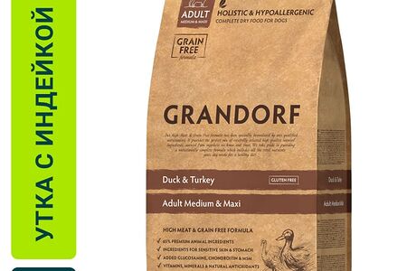 Сухой корм для собак Grandorf Adult Medium & Maxi для средних и крупных пород с уткой и индейкой 1кг доставка