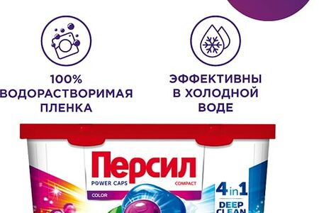 Капсулы "Персил Power Caps Color 4 in 1" отстирывают сложные пятна без разводов и утомительных полосканий. Эффективны уже при 30 °С. Легко использовать — средство уже правильно дозировано для оптимального результата. Подходят для режимов стирки от 40 минут и более. 0% фосфатов и хлорного отбеливателя. 100% растворимая и биоразлагаемая пленка.