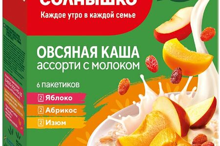 Каша овсяная Ясно солнышко с молоком Ассорти 6пак*45г - это коллекция молочных каш моментального приготовления, не требующих варки. Они сделаны из натуральных ингредиентов без добавления ароматизаторов, консервантов, красителей и стабилизаторов. В состав входят овсяные хлопья, обработанные по технологии двойного пропаривания, цельное сухое молоко, немного сахара и соли, а также три вида наполнителей: изюм, кусочки сушеного абрикоса или яблока. Готовить такие каши проще простого: переложите смесь в тарелку, залейте 180 мл кипятка или горячего молока, оставьте под крышкой на 3-5 минут и наслаждайтесь вкусным и полезным завтраком! В коробке - 6 пакетиков (по 2 штуки каждого вкуса).
