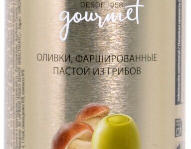 Сведения о составе: Вода, зелёные оливки, паста из грибов (грибы; Белый гриб (Boletris edulis), Вешенка (Pleurotus ostreatus), лук, оливковое масло первого отжима, загуститель: альгинат натрия (Е401), подкопчёное оливковое масло, бренди (содержит пищевые добавки красители Е150а. E150d усилители вкуса и аромата: глутамат натрия (Е621 и 5-рибонуклеотид динатрия (Е635), регулятор кислотности: лимонная кислота (Е330), антиокислитель: аскорбиновая кислота (Е300). Может содержать следы сульфитов.Пищевая ценность: 181,0,19,1.5Условия хранения: 35,0Срок годности в днях: 1095Страна изготовления: ИспанияСведения об упаковке: Жестяная банкаПроизводитель: СТМ