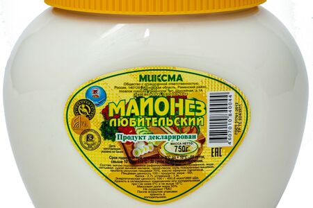 Сведения о составе: Масло подсолнечное рафинированное дезодорированное, вода питьевая, сухой яичный меланж, сахар-песок, соль поваренная пищевая, кислота уксусная пищевая 70%, масло эфирное горчичноеПищевая ценность: 451,2.7,50,1.9Условия хранения: 18,0Срок годности в днях: 60Страна изготовления: РоссияСведения об упаковке: Пластиковая банкаПроизводитель: Миксма