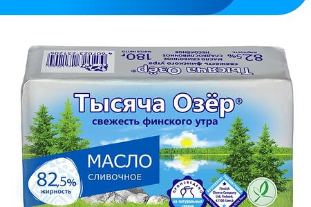 Масло сливочное Тысяча Озер 82.5% 180г - это натуральный продукт, приготовленный из свежего отборного молока. Строгое соблюдение рецептуры и традиционная жирность придают маслу мягкий сливочный вкус и приятный молочный аромат. Сбалансированный комплекс витаминов, жиров и аминокислот, необходимых для здоровья, хорошо усваивается организмом. Масло используется для приготовления бутербродов, слоеного и песочного теста, кондитерского крема и соуса Бешамель, добавляется в каши, горячие мясные и рыбные блюда, гарниры. Упаковано в фольгу, которая сохраняет вкусовые и питательные свойства.