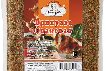 Приправа Спец и я Морозова Сванская 150г 100% натуральная смесь специй, приготовленная из уцхо-сунели (голубого пажитника), кориандра, укропных семечек, зелени укропа, куркумы, перца чили, тмина и соли. Это традиционная грузинская приправа, используемая для приготовления супов, мясных, овощных и рыбных блюд, маринадов и соусов. Она названа в честь Сванетии области на северо-западе Грузии, где произрастают все растения, входящие в состав смеси. Приправа абсолютно безопасна для здоровья, ведь в ней нет искусственных ароматизаторов, консервантов, усилителей вкуса и красителей. Она придаст вашим кулинарным шедеврам неповторимый аромат и пикантность. Герметичный пакет надежно сохраняет вкусовые качества и полезные свойства продукции в пределах всего срока годности.