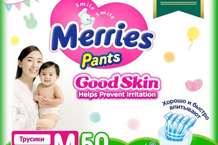 Японские подгузники-трусики Merries Good Skin M 7-12кг 50шт созданы с особенной заботой о коже и комфорте вашего ребёнка. Merries Good Skin – комфортные трусики для активных малышей. Быстро впитывают и надёжно удерживают большой объём жидкости, оставляя кожу ребёнка сухой. Трусики легко снимать, надевать и удобно носить. Они хорошо сидят на талии, не сползают, не жмут и не оставляют следов на нежной коже малыша. Можно использовать как дневные подгузники, когда ребёнок максимально подвижен, так и в качестве ночных подгузников, когда малыш дольше не переодевается. Эластичный поясок и оборочки вокруг ножек комфортно прилегают к телу, не образуя щелей, даже если ребёнок много ворочается ночью. Гипоаллергенные материалы не вызывают раздражений, опрелостей и дискомфорта. Внешний слой трусиков надёжно удерживает влагу и выводит прелый воздух наружу, предотвращая парниковый эффект и появление раздражений на нежной коже ребёнка. Полимерный абсорбент превращает жидкость в гель и защищает от протеканий даже при значительном надавливании. Внутренняя поверхность подгузника остаётся удивительно мягкой для кожи ребёнка и не прилипает к попке даже после того, как впитает большой объём жидкости. Впитывающий слой располагается по поверхности трусиков так, что жидкость не скапливается в одном месте, подгузник не сбивается в комок, не провисает и не стесняет движений малыша, даже когда уже заполнен. Подходят для девочек и мальчиков. Не требуют использования защитных кремов и присыпок. Эта серия изготавливается в Индонезии под постоянным контролем японского производителя.