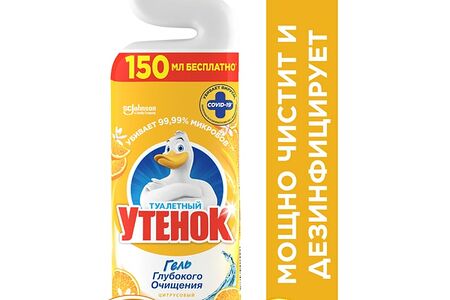 Чистящее средство для унитазов "Туалетный Утенок Гель глубокого очищения Цитрусовый", 900 мл. "Туалетный Утенок Гель глубокого очищения" для унитаза обеспечивает максимальное очищение налета и ржавчины, а также устраняет неприятные запахи и дарит свежий аромат. Сильная формула на основе соляной кислоты убивает 99,99% микробов, включая вирусы, аналогичные по устойчивости SARS-COV-2, вызывающему COVID-19. Благодаря уникальной форме горлышка бутылки лучше попадает в труднодоступные места скопления бактерий под ободком унитаза. Основные преимущества: убивает 99,99% микробов; устраняет известковый налет и минеральные отложения; уникальная форма горлышка обеспечивает нанесение на 360°; восхитительный свежий аромат без запаха хлора. Дезинфицирующий эффект в отношении исследованных микроорганизмов (E.coli, S. aureus, P. aeruginosa, C. albicans) достигается при экспозиции 30 минут. Дезинфицирующий эффект в отношении исследованных вирусов (Poliovirus, Adenovirus) достигается при экспозиции 15 минут.