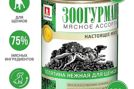 Влажный корм для щенков Зоогурман Мясное ассорти Телятина нежная 350г - это высококачественное питание для щенков всех пород. В его основе лежит 100% телятина и говяжьи субпродукты, которые обеспечивают ежедневную потребность вашего питомца в белке. Благодаря правильно сбалансированному составу корм обеспечит собаке необходимый набор макро- и микроэлементов, аминокислот и минералов. Он способствует здоровому росту и развитию, укрепляет иммунную систему, делает шерсть блестящей и шелковистой, а кости и суставы крепкими. Не содержит сою, ГМО, искусственные красители, усилители вкуса, мясокостную и перьевую муку. Суточная норма кормления: 25-35 гр корма на 1 кг веса щенка.