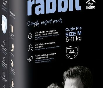 Трусики-подгузники Fancy Rabbit for home 6-11кг М 44шт – это белоснежные ультратонкие подгузники, выполненные в виде трусиков. Изготовлены из абсолютно безопасных «дышащих» материалов, не имеют постороннего запаха. Не содержат отдушек, хлора, парабенов, фталатов, латекса и тяжелых металлов, поэтому не раздражают нежную кожу и не вызывают аллергических реакций. Моментально впитывают влагу, а современный японский абсорбент надежно удерживает ее внутри, обеспечивая малышу до 12 часов сухости. Благодаря особой конструкции отлично сидят и не комкуются между ножек. Мягкие и нежные, словно кашемир, они не натирают кожу, не выделяются под одеждой, не доставляют малышу дискомфорта и не стесняют его движений. Формат удобен для домашнего использования. Упаковка подлежит последующей переработке.