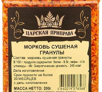 Морковь Царская приправа сушеная гранулы 200г – 100% натуральная морковь, которую уже помыли, почистили, нарезали и бережно высушили. Морковь – это полезный низкокалорийный корнеплод, богатый витаминами и минералами. В ней содержится бета-каротин – очень ценный антиоксидант, который подавляет свободные радикалы, тем самым предотвращая развитие опасных заболеваний. Морковка очень хорошо хранится в сушеном виде, а попав в воду или масло, быстро восстанавливает свои свойства. Гранулы отлично подойдут для супов, вторых блюд, соусов, подливок, теплых салатов и пирогов. Упаковка – удобная баночка с крышкой.