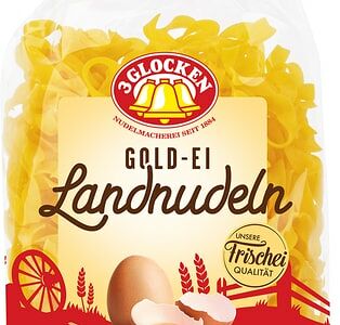 Лапша 3 Glocken Gold-Ei короткая прямая 350г - высококачественные макаронные изделия премиум-класса немецкого производства. Производится из пшеницы твердых сортов (дурум), чистой родниковой воды и отборных свежайших яиц (4 яйца на 1 кг). Лапша имеет красивый золотисто-желтый оттенок. При варке лапша увеличивается в размере, но не разваривается. Превосходно сочетается с различными соусами, мясом, птицей, рыбой и овощами. Чтобы получить идеальный вкус, лапшу следует варить в соответствии с рекомендациями, указанными на упаковке. Для удобства хранения упаковка оснащена клипсаторной лентой.