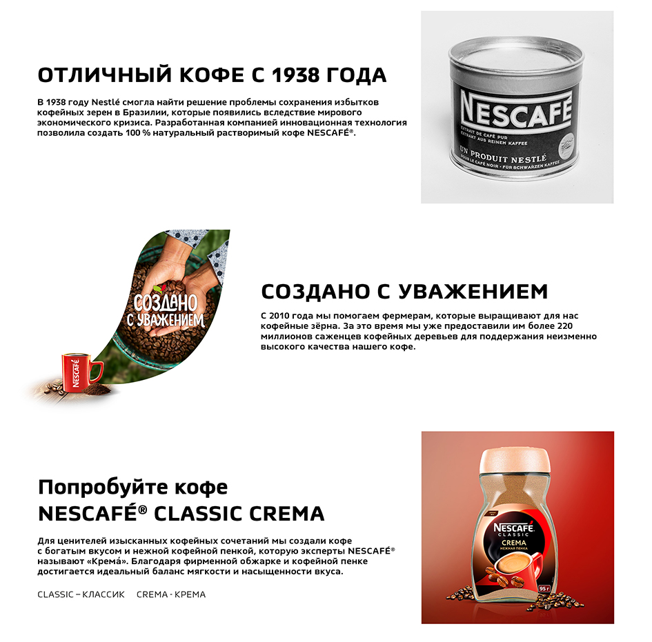 Кофе молотый в растворимом Nescafe Classic 130г это 100% натуральный растворимый кофе, изготовленный из отборного сырья с добавлением молотых зерен Арабики. Готовый напиток порадует вас богатым вкусом и насыщенным ароматом. Он взбодрит и приведет в тонус ранним утром, а также обеспечит энергией для долгой и продуктивной работы. Для приготовления одной порции насыпьте в чашку 2 чайные ложки кофе и добавьте горячую (но не кипящую) воду. При желании дополните напиток сахаром, молоком или сливками. В процессе употребления вы можете увидеть осадок кофейную гущу, свидетельствующую о реальном содержании молотого кофе. Мягкая герметичная упаковка полностью исключает попадание кислорода, обеспечивая полную сохранность органолептических свойств, текстуры и аромата продукта. Для удобства хранения после вскрытия в верхней части пакета предусмотрена многоразовая zip-застежка.