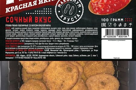Сведения о составе: Хлеб пшенично-ржаной (мука пшеничная хлебопекарная высшего сорта, вода, мука ржаная хлебопекарная обдирная, сахар, дрожжи, экстракт темного ячменного солода, закваска, кориандр), масло подсолнечное рафинированное дезодорированное, комплексная пищевая добавка со вкусом и ароматом Красной икры (соль пищевая, декстроза, сухое молоко, усилители вкуса и аромата глутамат натрия, гуанилат натрия, инозинат натрия, дрожжевой экстракт, пшеничная мука, молочная сыворотка, молокосодержащий сухой продукт, ароматизаторы (содержат рыбу, ракообразных), сырный порошок, краситель: экстракт паприки). В продукте возможно присутствие следов молока, ракообразных, рыбы, арахиса, сои, сельдерея, горчицыПищевая ценность: 346,11.5,18,71Срок годности в днях: 180Страна изготовления: РоссияСведения об упаковке: ЛотокПроизводитель: Парус