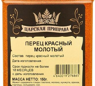 Специя Царская приправа Перец красный молотый 150г – высушенные и перемолотые стручки перца «чили». Некоторые сорта этого перчика настолько «злы», что прикасаться к плодам можно только в резиновых перчатках – так велика опасность получить ожог кожи. Чили широко применяется во всем мире как самостоятельная пряность, придающая блюдам ярко-красный акцент и обжигающе острые нотки. В основном его используют для приготовления мясных и рыбных блюд, супов, колбасных изделий, фасоли, риса, соусов и капусты. Упаковка – удобная баночка с крышкой.