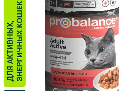 Полнорационный сбалансированный консервированный корм премиум-класса для кошек, ведущих активный образ жизни. Корм рекомендован для ежедневного кормления взрослых кошек всех пород. Рацион Probalance Active создан практикующими датскими ветеринарами специально для активных и энергичных кошек. Особенности корма для активных кошек Probalance Active: в состав входят натуральные мясные и рыбные продукты высокого качества, которые обеспечивают кошку белком, а также всеми необходимыми питательными веществами. Корм обогащен витаминами, минералами и аминокислотами, включая таурин — незаменимую для кошек аминокислоту, от которой зависят работа сердца и острота зрения. Фитокомпозиция «Fitocare for cats» (запатентованный сбор из целебных трав) обладает общеукрепляющим и тонизирующим свойствами, способствует долголетию вашей кошки. Полностью натуральный состав без красителей и Е-консервантов. Рационы Probalance — это баланс вкуса и пользы. Все продукты корма сертифицированы и безопасны для животных.