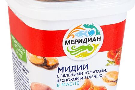 Мидии Меридиан с вялеными томатами чесноком и зеленью в масле 415г доставка