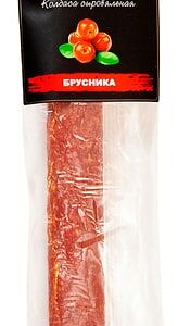 Сведения о составе: Свинина, белок животный, посолочно-нитритная смесь (соль поваренная, фиксатор окраски (нитрит натрия)), мальтодекстрин, декстроза, брусника сушеная (ягоды брусники, сахар, масло подсолнечное), специи (чеснок, мускатный орех), волокна пищевые (пшеничные), стабилизатор (дигидропирофосфат натрия), антиокислители (аскорбиновая кислота, изоаскорбат натрия), красители (красный свекольный, кармины), ферментированный рис, рапсовое масло, усилитель вкуса и аромата (глутамат натрия), ароматизаторы, стартовые культуры. На предприятии используются орехи, молоко, яйца, горчица, сельдерей и продукты их переработки. При хранении продукта допускается образование белого налета минерального происхождения (кристаллизация соли), что не является признаком ухудшения качества продуктаПищевая ценность: 420,11,42Условия хранения: 6,0Срок годности в днях: 120Страна изготовления: РоссияСведения об упаковке: Вакуумная упаковкаПроизводитель: Протвинский мясокомбинат