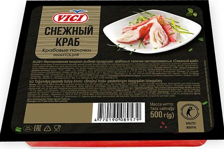Сведения о составе: сурими (фарш из зоологического вида рыбы: красный нитепёр (Nemipterus japonicus); влагоудерживающий агент: полифосфаты); вода; крахмал пшеничный; загуститель: дикрахмалфосфат; сахар; крахмал картофельный; масло растительное; соль; белок яичный; ароматизаторы; красители: кармины, экстракт паприки; желток яичный. Возможно наличие следов ракообразных и продуктов из нихПищевая ценность: 100,10.12,0.5,13.8Условия хранения: 5,0Срок годности в днях: 75Страна изготовления: РоссияСведения об упаковке: Вакуумная упаковкаПроизводитель: Вичюнай Русь