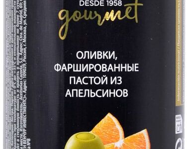 Сведения о составе: Вода, оливки зелёные, паста из апельсинов 6%* (апельсины,загуститель: E401, ароматизатор), соль, усилители вкуса и аромата: E621 и E635, регулятор кислотности: E330, антиокислитель:E300. *% содержание относительно массы основного продукта. Допускается содержание косточек или их фрагментов. Можетсодержать следы сульфитовПищевая ценность: 154,1.1,16,0Условия хранения: 35,0Срок годности в днях: 1095Страна изготовления: ИспанияСведения об упаковке: Жестяная банкаПроизводитель: СТМ