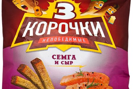 Ржаные сухарики со вкусом семги с сыром. Для 3-х Корочек используется свежеиспеченный хлеб. Сухарики производят без обжарки во фритюре. Современная технология сохраняет полезные свойства злаковых культур и обеспечивает сухарикам незабываемый вкус. Ржаные сухарики легкий снек для перекуса и отличная закуска к пенным напиткам. Но их можно использовать и в кулинарии. Ароматные длинные сухарики придадут эстетическую завершённость разнообразным супам-пюре: тыквенному, грибному, сырному, супу из цветной капусты и многим другим.