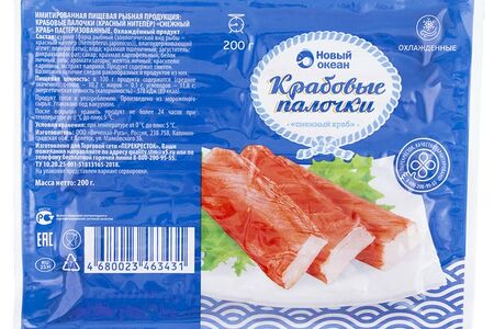 Крабовые палочки Новый океан Снежный краб 200г охлажденное кулинарное изделие из имитированного мяса морепродуктов, готовое к употреблению. Производится из рыбного фарша (сурими) и вспомогательных компонентов по особой технологии, позволяющей сохранить в нем все ценные вещества, которыми богата рыба. Палочки Снежный краб обладают особенно сочной волокнистой текстурой и нежным тонким вкусом. Они прекрасно подходят как для обычного перекуса, так и для приготовления различных блюд. Вакуумная упаковка надежно сохраняет свежесть, вкусовые свойства, аромат и структуру в течение всего срока годности.