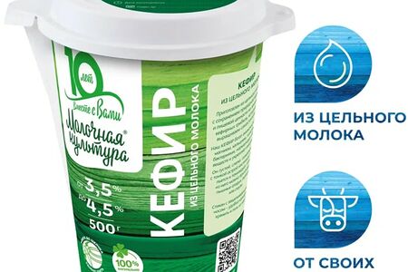 Кефир Молочная культура 3.5-4.5% 500мл - 100% натуральный кисломолочный продукт, который производится из цельного молока и закваски на кефирных грибках. Молоко, получаемое от собственных коров, пастеризуется при оптимальной температуре и поэтому сохраняет максимальное количество кальция и фосфора, легкоусваиваемого белка и витаминов. Густой, с классической легкой кислинкой кефир благотворно влияет на пищеварение и работу кишечника. Это отличный диетический напиток, который поможет сохранить ваше здоровье, фигуру и красоту. Расфасован в фирменный стаканчик с носиком, чтобы вам было удобно употреблять его, где бы вы ни находились.