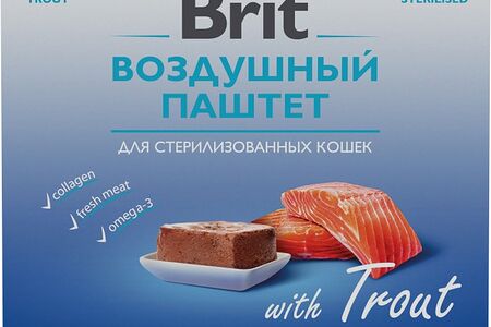 Влажный корм для стерилизованных кошек Brit Воздушный паштет с форелью 100г – полнорационный консервированный корм премиум-класса. Предназначен для взрослых стерилизованных и кастрированных животных. Производится по технологии аэрации без добавления искусственных ароматизаторов и консервантов. Сырье помещают в специальный аппарат – паштетный эмульситатор, где оно одновременно измельчается, смешивается, взбивается и насыщается воздухом. Готовый паштет имеет нежную, воздушную консистенцию и приятный вкус, благодаря чему обязательно понравится вашему питомцу. Состав корма тщательно сбалансирован: он содержит натуральное мясо и рыбу, а также витамины, минералы, таурин, полезные растительные компоненты. Герметичная алюминиевая упаковка нового поколения надежно сохраняет свежесть продукта и легко открывается.