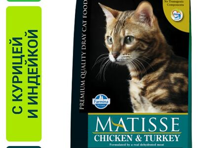 Линия Matisse — корма для кошек суперпремиум-класса. Натуральные ингредиенты гарантируют высокую вкусовую привлекательность для удовлетворения самых привередливых кошек. Курица, индейка, рыба (лосось и тунец) и яйца — основные источники белка высокой биологической ценности. Рыбий жир обеспечивает оптимальный баланс омега-3 и омега-6. Рис и кукуруза хорошо усваиваются и обеспечивают организм необходимым уровнем энергии. Сбалансированное содержание клетчатки обеспечивает оптимальную работу пищеварительной системы. Оптимальное содержание таурина поддерживает качество зрения и обеспечивает здоровье сердца. Сбалансированное содержание витаминов и минеральных веществ поддерживает здоровье и улучшает качество жизни. Контроль pH мочи снижает риск развития мочекаменной болезни. Отсутствие генетически модифицированных компонентов.
