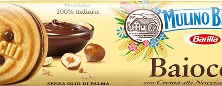 Печенье Mulino Bianco Baiocchi сандвичное сахарное с какао-ореховым кремом 168г – идеальное решение для перекуса в любое время и в любом месте! Каждое кондитерское изделие состоит из двух нежнейших сахарных печенек, между которыми имеется кремовая прослойка на основе натурального итальянского фундука и какао. Благодаря простому рецепту и высокому качеству ингредиентов эти лакомые сэндвичи обладают поистине неповторимым вкусом. Они отлично сочетаются с чаем и кофе, а также подходят для быстрого утоления голода. Небольшую упаковку можно взять с собой на работу, на учебу или в гости. Продукт не содержит искусственных добавок, усилителей вкуса, консервантов, ГМО и пальмового масла.
