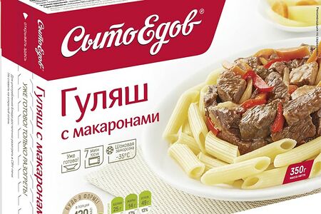 Гуляш с макаронами СытоЕдов 350г - готовое блюдо, сделанное исключительно из натуральных ингредиентов специально для тех, кто ценит свое время и любит вкусную домашнюю еду. Сочная говядина в ароматном соусе с отваренными макаронами-перьями - все как дома! Перед употреблением лоток с гуляшом следует прогреть в микроволновой печи, приоткрыв или проколов защитную пленку (не размораживая предварительно). Продукт не содержит красителей и консервантов. Технология шоковой заморозки позволяет сохранить все вкусовые качества блюда.