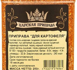 Приправа Царская приправа для картофеля 250г – сбалансированный набор специй, который выгодно дополнит вкус и аромат блюд из картофеля. В состав входят только натуральные ингредиенты: морская соль, паприка, репчатый лук, чеснок, кориандр, черный перец, укроп, острый красный перец. Смесь может использоваться при приготовлении печеного и жареного картофеля, картофельных оладий, овощных котлет и супов. Не содержит искусственных добавок, усилителей вкуса и ГМО. Производитель использует высококачественное сырье и строго соблюдает требования к обработке специй. Упаковка – удобная баночка с крышкой.