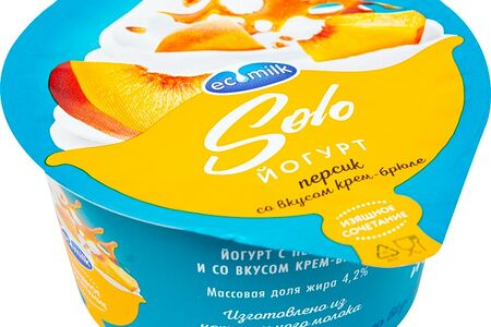 Йогурт Экомилк с персиком и со вкусом крем-брюле 4.2% 130г – нежный десерт с густой консистенцией и приятным, в меру сладким вкусом. Производится на основе натурального молока на современном российском предприятии, оснащенном высокотехнологичным оборудованием. В его составе также присутствуют спелые персики и натуральный ароматизатор «Крем-брюле» – они придают лакомству особую прелесть и делают его неповторимым. Йогурт – это полезный кисломолочный продукт, который служит источником витаминов и минералов, помогает укрепить иммунитет, улучшает пищеварение. Ecomilk Solo – это новая линейка молочных десертов, которые помогут вам отвлечься от повседневной серости и ощутить прилив вдохновения.