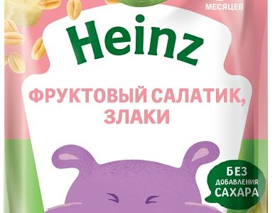 Пюре Heinz Фруктовый салатик и злаки 90г натуральное лакомство для малышей с 6 месяцев. Прекрасно подходит для расширения рациона и знакомства с новыми вкусами. Производится на основе яблочного, бананового и грушевого пюре с добавлением цельнозерновой муки, в которой сохранена вся польза злаков. Десерт обогатит растущий организм аскорбиновой кислотой, пектином, магнием, железом и растительной клетчаткой, а также подарит мощный заряд энергии. Мягкую упаковку-пауч с дозатором удобно брать с собой на прогулку или в дорогу. Для кормления вам не потребуется ложечка, ведь ребенок сможет кушать самостоятельно, слегка надавливая пальчиками на пакетик. Продукция не содержит сахара, крахмала, консервантов, красителей, ароматизаторов и ГМО.
