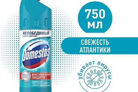Средство чистящее Domestos Свежесть Атлантики 750мл высокоэффективный густой гель, который идеально подходит для поддержания безупречной чистоты во всем доме. Уникальная формула, в состав которой входят не только чистящие, но и дезинфицирующие компоненты, уничтожает до 100% известных микробов, в том числе грибки, споры, бактерии и вирусы. Она с легкостью удаляет даже самые сложные загрязнения, расщепляет известковый налет и предотвращает его повторное появление, нейтрализует неприятные запахи. В неразбавленном виде средство может использоваться для очищения и дезинфекции унитаза, ванны, раковины, стоков и сливов, а в разбавленном для мытья множества поверхностей (пола, кафеля, плитки, кухонных столешниц, мусорных ведер) и даже для отбеливания белья. Эргономичный флакон с изогнутым носиком-дозатором обеспечивает удобство в процессе использования. Защитите свой дом с помощью продукции ТМ Domestos!