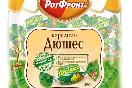 Карамель Дюшес 250г - это известный леденец со вкусом и ароматом спелой десертной груши, произведенный на одном из старейших кондитерских предприятий России "Рот Фронт" (в 2016 году фабрике исполнилось 190 лет). Продукт имеет Кошерный сертификат. Может употребляться в Пост. Каждая конфета упакована в индивидуальную обертку, поэтому вам будет удобно отсыпать горсть в карман или сумочку, чтобы потом угостить своих друзей или коллег и полакомиться самому. При хранении рекомендуется избегать попадания прямых солнечных лучей.
