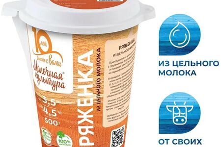 Ряженка Молочная культура 3.5-4.5% 500мл - 100% натуральный кисломолочный продукт, который производится из цельного молока и закваски на термофильных молочнокислых стрептококках. Молоко, получаемое от собственных коров, пастеризуется при оптимальной температуре и поэтому сохраняет максимальное количество кальция и фосфора, легкоусваиваемого белка и витаминов. Кремовая, с приятным ароматом топленого молока ряженка благотворно влияет на пищеварение и работу кишечника. Это отличный диетический напиток, который поможет сохранить ваше здоровье, фигуру и красоту. Расфасован в фирменный стаканчик с носиком, чтобы вам было удобно употреблять его, где бы вы ни находились.