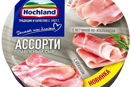 Сыр плавленый Hochland "Мясное ассорти": с ветчиной, с ветчиной по-итальянски, с беконом, порционный, 50%, 140г – настоящая находка для истинного гурмана! Это целых три изготовленных из натурального сыра изысканных мясных вкуса в одной коробочке. Много крупных кусочков настоящих бекона и ветчины равномерно распределены внутри треугольничков нежного и тающего плавленого сыра. И на цельнозерновом хлебе, и на поджаристом тосте этот сыр станет и прекрасным началом дня или идеальным перекусом вне дома. Готовьте с сырными треугольниками бутерброды и яичницу, добавляя пряности, болгарский перец, томаты, выбирая между ветчиной и беконом по-отдельности или соединив их вместе. Также этот аппетитный сыр прекрасно подходит к картофелю или пасте, запеченным овощам, супам и румяным гренкам.