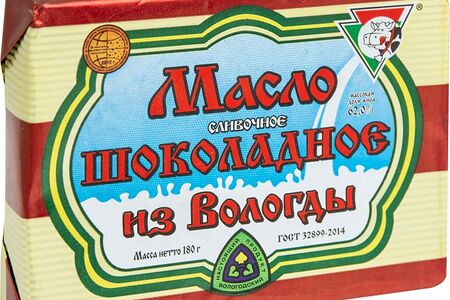 Масло сливочное Из Вологды Шоколадное 62% 180г - это настоящий вологодский продукт, который производится из пастеризованных сливок высокой жирности с добавлением сахара и какао-порошка. У него плотная однородная консистенция, характерный темно-коричневый цвет и выраженный сливочно-шоколадный вкус. Сливочное масло - полезный молочный продукт, в нем содержатся витамины A, D и E, кальций, магний и фосфор. Регулярное употребление масла способствует хорошему зрению, поддерживает здоровье кожи, укрепляет нервную систему, нормализует пищеварение. Не содержит консервантов и растительных жиров.