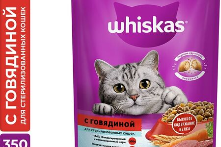 Сухой корм для стерилизованных кошек и котов Whiskas полнорационный с говядиной и вкусными подушечками 350г доставка