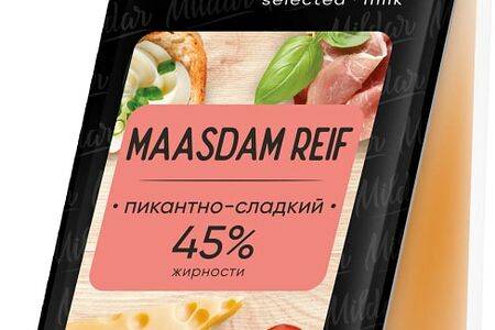 Сыр Mildar Маасдам рейф 45% 220г является частью уникальной линейки полутвердых и твердых сыров натурального созревания. Он производится по классическому рецепту из свежего коровьего молока. Сверху на него наносят минимум три слоя латекса, образующего тонкую непроницаемую пленку, что способствует медленному освобождению сыра от влаги и естественному процессу созревания. Маасдам рейф обладает плотной маслянистой консистенцией, желто-золотистым цветом и большими глазками правильной формы. У него узнаваемый островатый аромат со сладковато-ореховыми нотками и пикантно-пряный сливочный вкус.