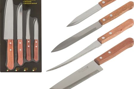 Сведения о составе: Набор ножей с деревянной рукояткой 4шт - поварской, универсальный, филейный, овощной малыйСрок годности в днях: 9999Страна изготовления: КитайСведения об упаковке: БлистерПроизводитель: China Light Guangzhou Hometrend Trading