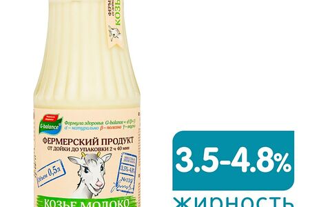 Молоко козье G-balance 3.5-4.8% 500мл - это натуральный фермерский продукт высшего качества, который разливается по бутылочкам уже через 2 часа 40 минут после дойки. Метод пастеризации с ультрафильтрацией сохраняет все уникальные полезные свойства свежего козьего молока. Оно усваивается быстрее и легче, чем коровье, и подходит даже людям с непереносимостью молочного белка (лактозы). Наличие густых сливок сверху напитка считается нормой (при переработке они не снимаются, сохраняя естественную жирность продукта).