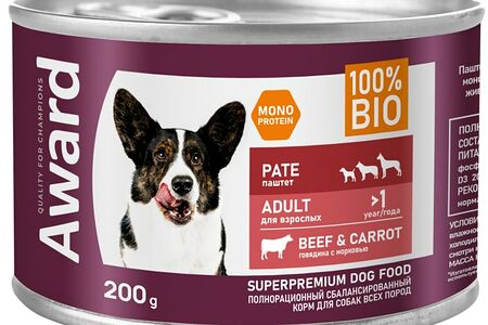 Влажный корм для собак Award Паштет из говядины с морковью 200г доставка