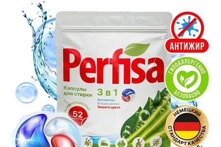 Капсулы для стирки Perfisa 3в1 ультраконцентрированные 52шт - гипоаллергенное средство, созданное для безупречного результата. Они профессионально отстирают пятна пота, крови, яиц, молочных и мясных продуктов. «Анти-жир» и энзимы делают их особенно эффективными против пятен растительного и животного происхождения: подсолнечного, сливочного масла, куриного жира. Одобрены дерматологами: безопасны для нежной кожи, подходят для стирки детской одежды и игрушек. Безопасны для септиков и экологически значимых мест. Обладают антистатическим эффектом, препятствуют образованию катышек, сохраняют цвета яркими и сочными. Не содержат агрессивных компонентов, фосфатов, хлора и парабенов. Растворяются даже в прохладной воде от 30°C. Выполаскиваются из ткани, не оставляя разводов и следов на одежде. Эффективны на коротких режимах стирки от 40 минут. Удаляют неприятные запахи и дарят белью приятный аромат «Океанская свежесть». Одна капсула «3 в 1» рассчитана на 5 кг белья.