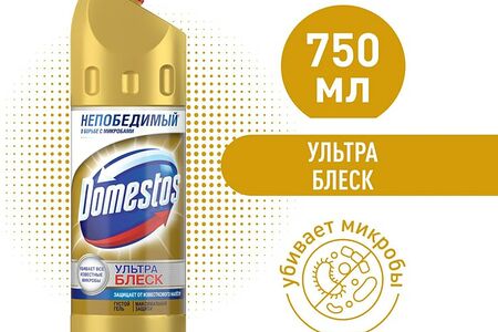 Средство для чистки унитаза Domestos Ультра Блеск 750мл поможет вам легко и быстро продезинфицировать и очистить сантехническое оборудование. Уникальная формула уничтожает 100% известных микробов и обеспечивает надежную защиту от серьезных кишечных заболеваний, которые могут быть вызваны этими патогенными микроорганизмами. Гель эффективно справляется с самыми разными загрязнениями, в том числе с плесенью, мыльным осадком, известковым налетом. Вот увидите, обработанные поверхности будут буквально сиять от чистоты! Благодаря густой гелеобразной текстуре он расходуется гораздо экономичнее, чем обычные жидкие средства. Эргономичный флакон с изогнутым носиком-дозатором обеспечивает удобство в процессе использования.