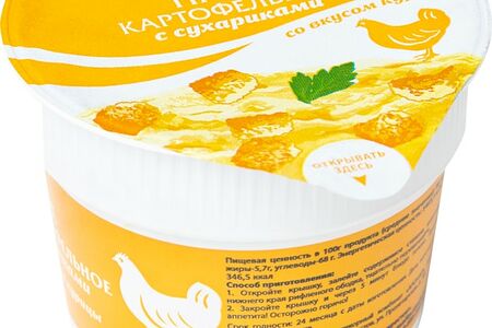 Сведения о составе: Картофельные хлопья, заменитель сухих сливок (крахмальная патока пшеничная, гидрогенизированный растительный жир, молочный белок, стабилизатор – фосфаты калия, эмульгатор – E471, антислеживающий агент – E551), сухарики пшеничные (мука пшеничная 1 сорта, вода питьевая, дрожжи хлебопекарные прессованные, соль поваренная пищевая, йодированная (соль, йодат калия)), соль поваренная пищевая, сахар, лук репчатый, ароматизатор «Курица», усилитель вкуса и аромата – глутамат натрия, зелень петрушки, куркумаПищевая ценность: 346.5,5.8,5.7,68Условия хранения: 25Срок годности в днях: 730Страна изготовления: РоссияСведения об упаковке: Порционная упаковкаПроизводитель: Аронап